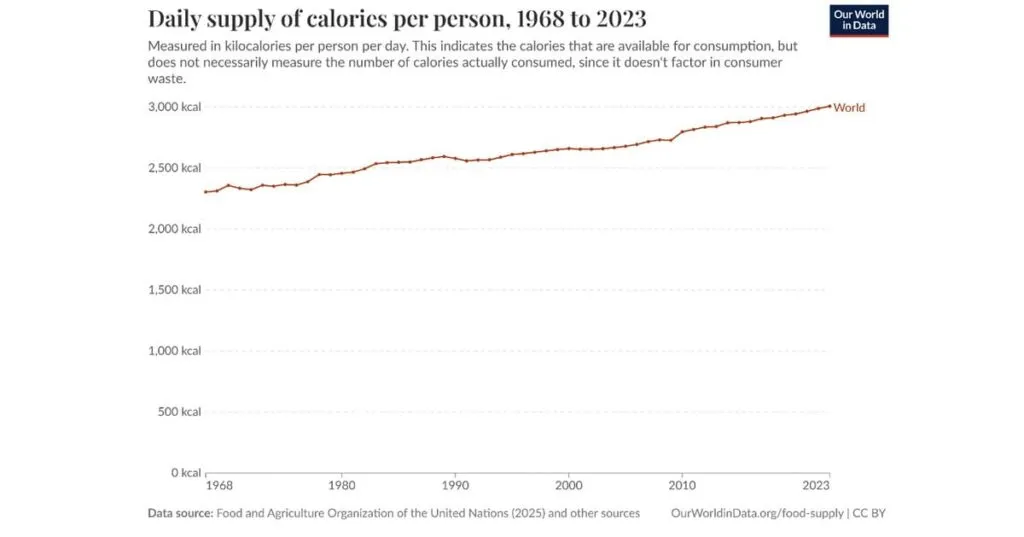 Partiamo dalla disponibilità di cibo. Nel 1968 l’apporto calorico medio disponibile nel mondo era pari a 2.300 kcal; nel 2023 ha raggiunto il valore record di 3.006 kcal.