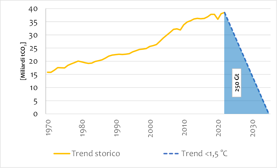 Trend storico delle emissioni di CO2 e di riduzione delle stesse per contenere l’aumento di temperatura entro gli 1,5 °C
